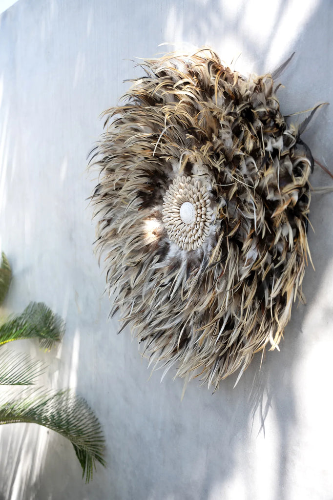 Notre magnifique affichage plume est une véritable beauté bohémienne pour décorer n'importe quel mur dans votre intérieur, terrasse couverte ou jardin. Le cercle central est entouré de coquillages placés à la main. Couleur: Gris Brun. Dimensions: 60 cm x 60 cm. Matériaux: Plumes - Coquillages.