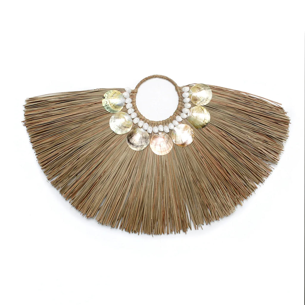 Notre magnifique présentoir en herbe d'alang sur pied, véritable beauté bohème pour décorer tout espace intérieur, terrasse couverte ou jardin. Demi-cercle central entouré de coquillages finement disposés à la main. Couleur: Blanc naturel. Support inclus? Oui. Matériaux: Herbe - Coquillages. Hauteur: 65cm. Largeur: 10cm. Longueur: 80cm.